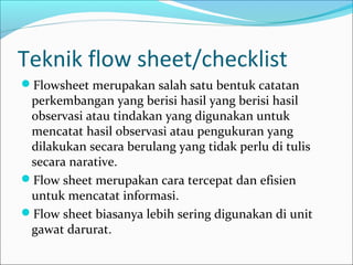 Mengurangi fragmentasi data pasien dan kep 2. Keputusan profesional tentang keadaan klien dituliskan secara konsisten sesuai aturan penulisan 2. Membatasi narasi yang terlalu luas 7. Format dokumentasi keperawatan 1)teknik dokumentasi teknik dokumentasi keperawatan merupakan cara menggunakan dokumentasi keperawatan dalam penerapan proses keperawatan. Ada tiga teknik dokumentasi yang sering digunakan: